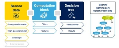 Устройство также оснащено собственным набором инструментов для обработки периферийных данных. Оно включает в себя конечный автомат для логики событий, ядро машинного обучения для классификации образов и функцию адаптивной самонастройки, которая позволяет датчику автоматически корректировать своё поведение при изменении условий. Эта способность к адаптации полезна в условиях, когда в один момент узел простаивает на складской полке, а в следующий — подпрыгивает на тележке. Вместо того, чтобы ждать, пока главный процессор выдаст новые инструкции, инерциальный измерительный блок может переключать режимы «на лету».